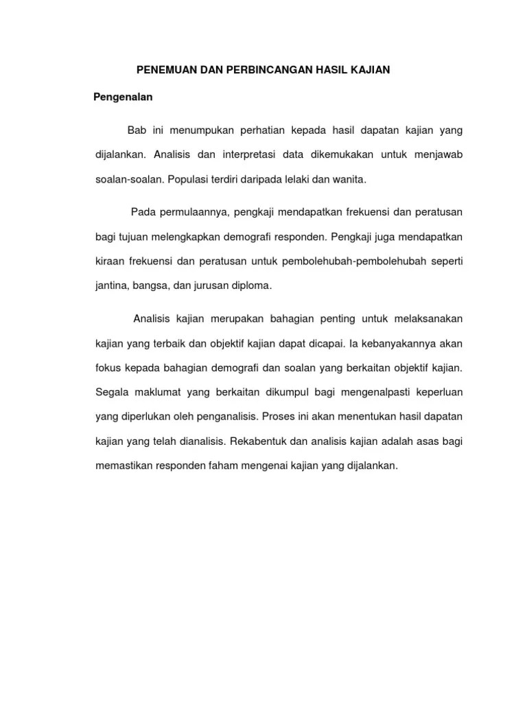 Laporan she101/2 hubungan etnik pusat pengajian pengurusan kumpulan 50 konsep hantaran perkahwinan dalam masyarakat · nurliyana idrus ; Me 5 0 dapatan kajian dan perbincangan bab ini menerangkan keputusan analisis data berdasarkan tindak balas responden terhadap soal selidik temu bual course . View contoh dapatan kajian 1.docx from pengajian am 111 at smk seri perling. Baca versi flipbook dari dapatan kajian dan perbincangan.